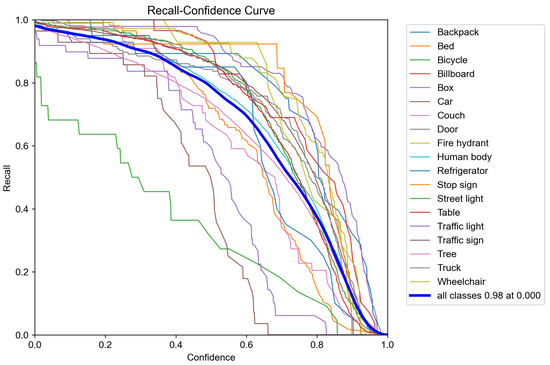 Plot of the recall curve for the trained YOLOv5s model. The recall measures the ability of the model to correctly identify all positive instances out of all actual positive instances, while the confidence represents the scores or probabilities assigned by the YOLOv5 model to its predictions.