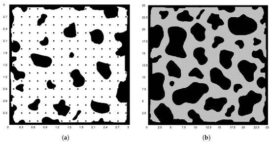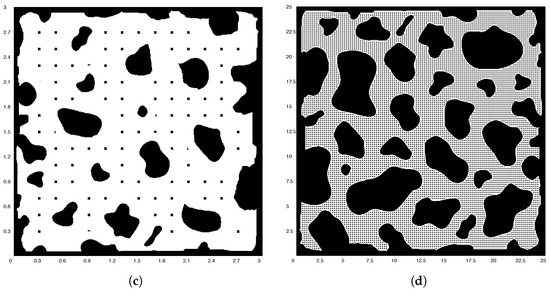 where , indicate the size of the maze-image and ceil(.) round the numeric value to the nearest integer greater than the element. Thus, whereas for Figure 1c the top-left node is number 1 and the bottom-right node is number 225, for Figure 1d the top-left node is number 1 and the bottom-right node is number 15,625. The distance between the grid nodes is L and each node represents a coordinate of a possible position of the autonomous robot. Subsequently, each maze along with its grid are merged as depicted in Figure 2a,b. As a consequence, each obstacle absorbs some nodes and the rest are collision-free nodes. However, in each maze in Figure 2a,b, there are nodes very close to obstacles and boundaries. This is a serious drawback, since the mobile robot can crash. To solve the inconvenient, each obstacle expands at a rate of