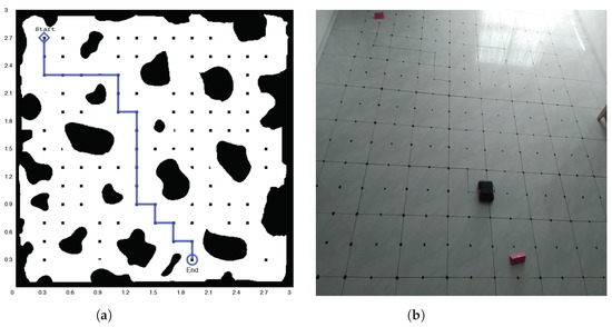 Then the mobile robot must follow the path shown in Figure 5a. By programming the Algorithm 1 on the Arduino IDE platform and configuring the mobile robot to control each wheel, the experimental evidence is shown in Figure 5b. As can be seen, the mobile robot successfully follows the previously generated collision-free path. A task similar to path in Figure 3b can be performed, where the Path vector only needs to change on the reconfigurable hardware. For this case, the length of the Path vector is 233. Volume and space in the construction of the maze along with the grid nodes illustrated in Figure 2d is not shown, for reasons of complexity. However, performance parameters of the proposed methodology can be obtained as given in Table 1, such as: Processing time, which indicates the time used by the methodology to deduce the shortest path, from the maze image as input until the generation of the Path vector. Travel time, is the time that uses the mobile robot to reach the goal from the start-point. Distance is the path measured in meters that the robot travels from start-point until the end-point and Battery consumption, which is the total energy consumed by the robot. For this work, the battery capacity is 2600 mAh and voltage 9 V. The features of the CPU used to run the methodology are: 1.6 GHz Intel core i5 and memory size 4 GB.