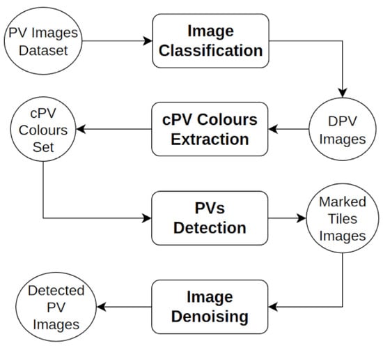 Figure 1 shows the high-level view of the four main phases of the proposed approach, consisting of: (i) classification, used to identify images featuring Detectable PV (DPV) panels, i.e., those exhibiting colours different enough from the colours of roofs, roads, ground, etc.; (ii) extraction of cPV colours from DPV images; (iii) detection of PVs in unannotated images using a sliding window that marks tiles on the panels’ surface; and (iv) denoising to filter the previous results. A brief overview is presented below, followed by a more detailed description of each phase.