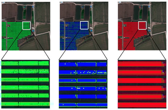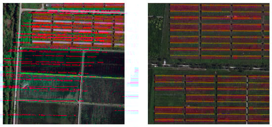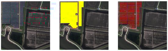 The final output of the proposed approach consists of images in which PV installations are detected. Depending on the algorithm parameters, both the panels’ surfaces and the whole PV array deployment areas can be detected, as shown in Figure 2.