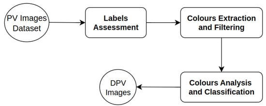 The image classification phase comprises three steps: (i) label assessment, which involves examining the area covered by the labels; (ii) pixel colour extraction and filtering, which finds PV panel colours that are different from the colours of other parts; and (iii) colour analysis and classification, which identifies images featuring DPV panels. Figure 3 provides an overview of the above steps. Each step is further described in the following subsections.