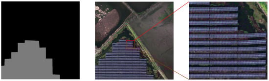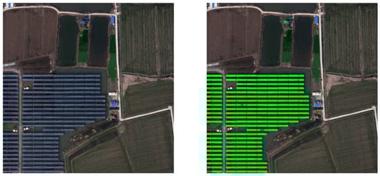 An example of an incorrect label in the dataset []: PV panels (left) are visible in the top left corner and the bottom right corner; however, the label (right) indicates only the top left corner.