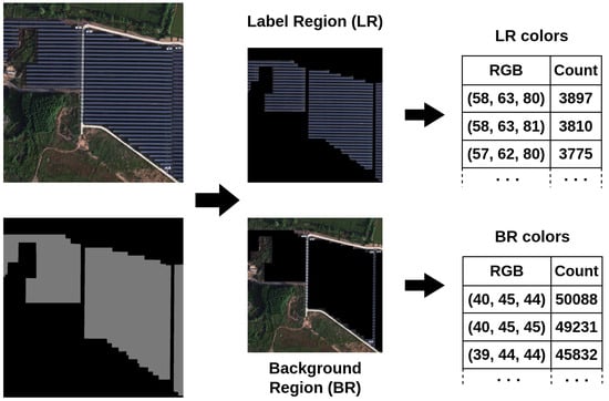 The implemented strategy operates as follows. Initially, dataset labels are used to partition each image into two regions: the Label Region (LR) and its complement, referred to as the Background Region (BR). Subsequently, the RGB colour components of the pixels are collected and the colour count for each region is computed, indicating the total number of pixels displaying every colour in each of the two regions. This information is aggregated from all images in the Ground dataset [] and used to build two sets: LR colours and BR colours (see Figure 6). For LR pixels that are actually depicting the background, rather than PV panels, it is a reasonable assumption that their colours are also commonly found in the BR. Therefore, for each colour within the intersection of the two sets, a comparison is performed between the corresponding counts. If the ratio between the BR count and the LR count exceeds a threshold, that colour is characterised as a background colour and is removed from the LR set.