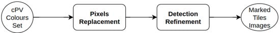 The algorithm consists of the two steps outlined in Figure 8: (i) pixel replacement, in which all pixels displaying cPV colours are marked, and (ii) detection refinement, in which windows of varying sizes are employed to cluster pixels belonging to PV arrays. The final output of the algorithm is a set of images in which the positions of detected PVs are marked. The individual steps are detailed in the following subsections.