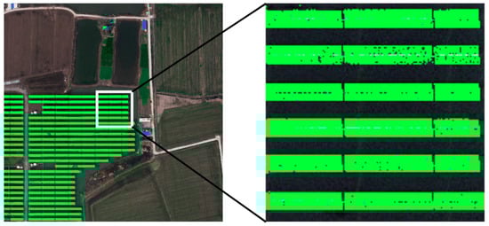 Initially, PV images are analysed and all pixels with a colour contained in the cPV set are identified and marked with RGB green. Figure 9 shows an example of the results of the pixel replacement operation. From the image, a high concentration of green pixels can be observed corresponding to the panel surfaces. Nonetheless, a more thorough inspection reveals that a significant minority of pixels in the same area have not been marked, as they do not feature cPV colours; see Figure 10 for a zoomed-in image. Therefore, the detection of PV panels in the images is further refined as described below.
