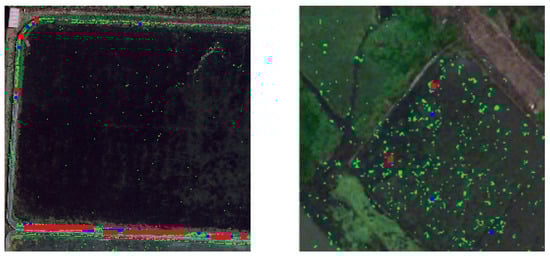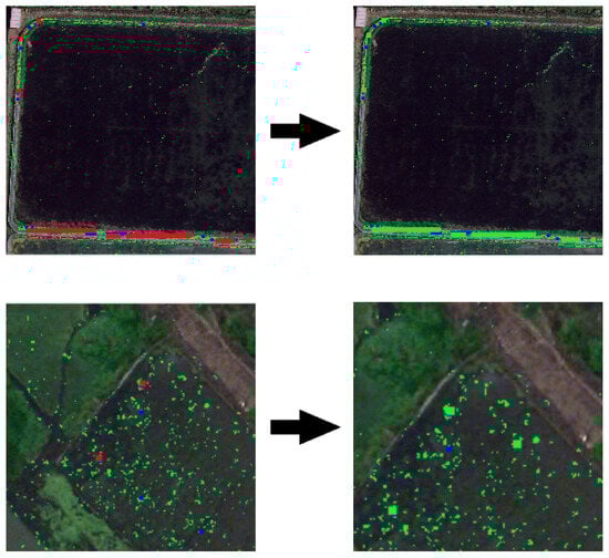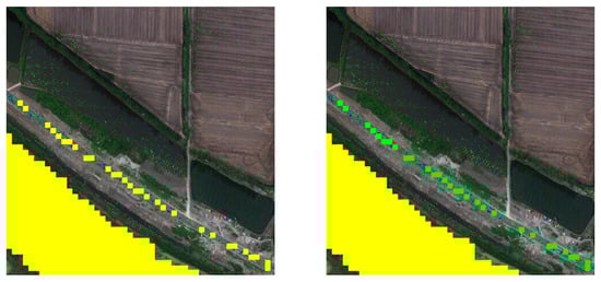 To achieve this, we apply the same methodology of the moving window, adapting it for the denoising task. We make adjustments to the three parameters; the specific evaluation logic as follows, First, in order to include the surrounding pixels, the size of the denoising window is set to be larger than the detection window size used in the last run of the algorithm. Then, a threshold is defined such that when the count of marked pixels within the window falls below the threshold, the pixels are classified as noise and consequently coloured in green, whereas detected panels are coloured in red. Figure 13 shows the results after the denoising pass. Pixels in green have been excluded from the detection results; only the pixels marked with the last execution’s marking colour (in this example, red) are considered detected panels.