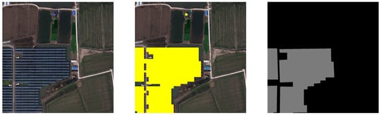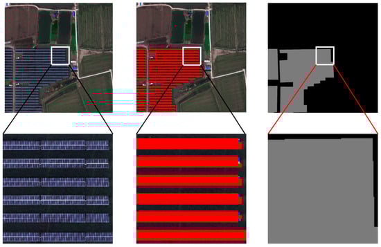 Example result of PV panel region detection (middle). The original dataset label is shown on the right.