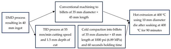The compacts were then soaked at 400 °C for 90 min before being hot-extruded at 400 °C to rods of 10 mm diameter (extrusion ratio of 12.25). Table 2 outlines the material designations of synthesized materials in this project, and Figure 2 outlines the processing pathways of DMD and TID materials in more detail.