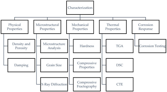 The study involves several types of characterization; Figure 3 shows the categorization of the experimental methodology and testing conducted to characterize the resulting Mg-MCA material.