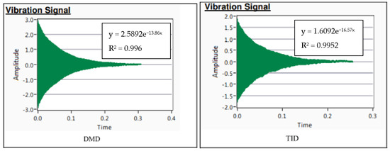 The damping response from the damping analysis in Figure 5 can be approximated with a best-fit curve in the form of Ae−bt, where b is the attenuation coefficient. This indicates that the TID material exhibited superior attenuation as well as damping capacity as outlined in Table 5, though with a slight trade-off in its Young’s modulus.