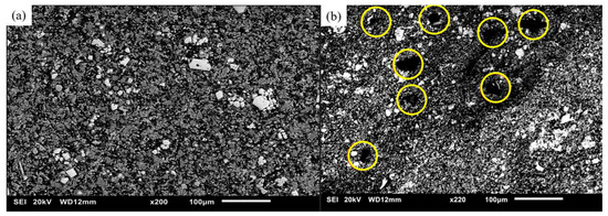 Scanning electron micrographs of Mg70Al18Zn6Ca4Y2 processed with (a) DMD and (b) TID, with pores circled in yellow on the latter.