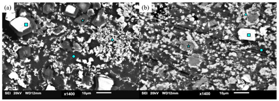 Figure 7 and Table 6 show the morphology of the phases as well as the EDS results showing the quantities of detected elements corresponding to those individual phases, with assigned spectrum numbers to the symbols used in identifying secondary phases.