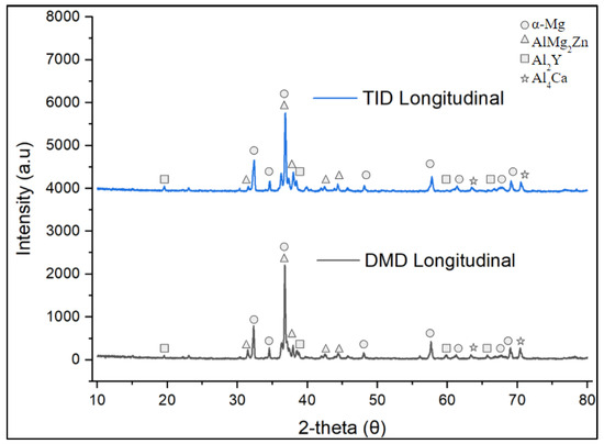 Figure 9 shows the X-ray diffractograms of the Mg70Al18Zn6Ca4Y2 materials studied in this work. The diffractograms were strikingly similar, showing the same phases in both DMD and TID samples.