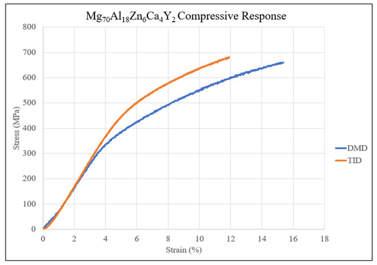 TID resulted in a higher yield strength (~14%) as well as a higher ultimate compressive strength (~4.7%), which was also attributed to the dislocation-hindering effect of finer, higher amounts and evenly distributed secondary phases resulting in higher loading required to fracture the material [27]. However, the failure strain was lowered, indicating lower ductility. This has parallels with porous aluminum alloys where porous materials exhibited reduced ductility [28] and can also be caused by stress concentrations which occur within the pores and secondary phases [29]. It is noteworthy that ductility remained >10%, suggesting a ductile nature and good deformability of the TID samples despite showing a comparatively lower value than DMD samples.