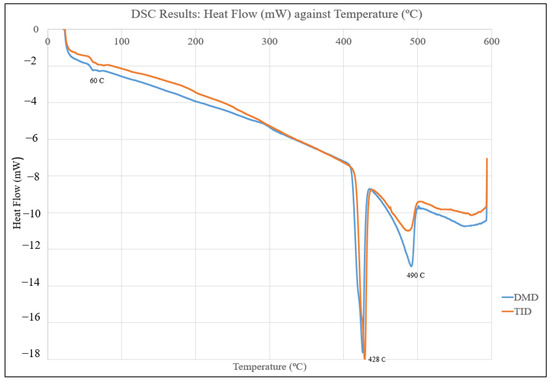 The DSC results confirmed that there were no significant differences in the material phase behavior/changes with temperature between the DMD- and TID-processed Mg70Al18Zn6Ca4Y2, and they also showed a negative peak (being endothermic) at 420 °C (corresponding to the melting point of zinc) [32]. Furthermore, a second, more endothermic peak was observed at 490 °C for both materials, implying a phase transformation of some type. This is significant as it serves as an indication that heat treatment or further processing of this material should take place below it to avoid further changes in material properties.