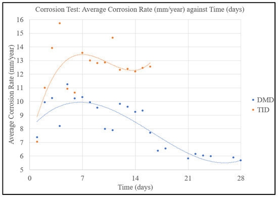 - The average corrosion rate of the TID material was significantly higher than its DMD counterpart, with nearly double the average corrosion rate.