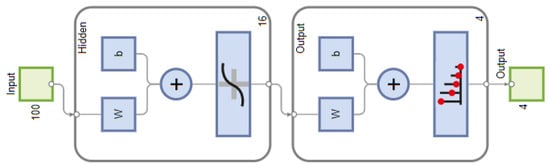 The ANN like all other supervised learning algorithms works in two stages. First, the ANN is trained offline and then tested online. For training the ANN, we used a back-propagation algorithm, namely, scale conjugate gradient []. The output layer produces four outputs between 0 and 1, corresponding to each class of signal, and the class with the highest value between (0,1) among the four is marked as the targeted signal class. A large dataset of 48,000 received WB signals, corresponding to different SNRs and compression ratios, is collected. The dataset is split into three parts, 70% is used for training, 15% for validation, and 15% for testing. ANN architecture is trained for hundred runs with the dataset being randomly divided and weights being randomly initialized in each run. An average accuracy of over 98% is reported for true positive classification; hence, increasing the number of layers will not increase accuracy further but only increase the training time. Therefore, the ANN architecture with 16 neurons in a hidden layer that offers the highest accuracy is used for spectrum characterization. Figure 3 shows the ANN architecture discussed above.