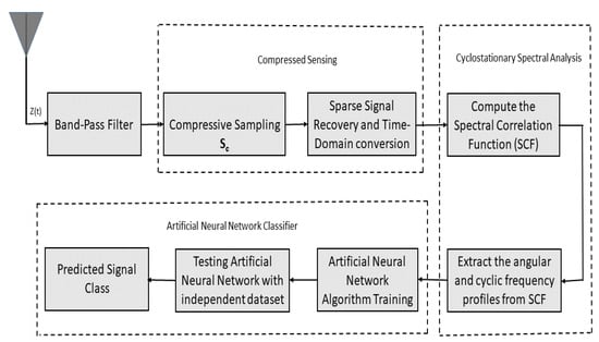 Our proposed algorithm is reported in Figure 4, where a CR received a WB composed of many NB signals. CR set the compression rate (K/N) to a specific value and used the random sampler to sample the WB signal and collect the related measurement matrix . Then the WB signal is reconstructed by exploiting BP from sub-Nyquist samples. Following this, the cyclostationary spectral analysis is performed and SCF is computed for each NB signal, and the corresponding features vector is formed by combining the f and profiles. The features vector is then used to train the ANN that classifies each NB signal in the occupied subband as a normal communication with a specific modulation or NB signal blocked by the stealthy jammer. In the end, the classifier is tested with an independent dataset.
