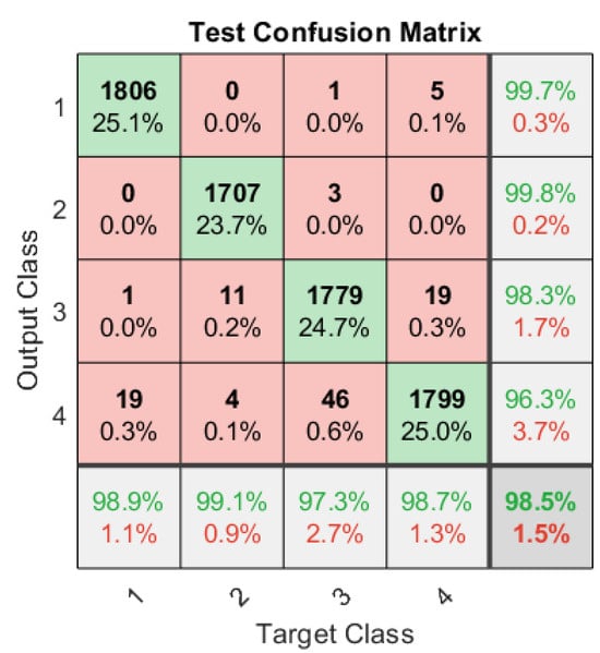 An ANN architecture is selected by taking in account the procedure outlined in Section 2.3. The ANN is trained, tested, and validated with a dataset of 48,000 signals, that was created by acquiring WB signals at different compression ratios, and SNRs. Therefore, the performance of the algorithm is independent of these parameters. In Figure 5, the total accuracy of the ANN-based classifier in the existence of a pulsed modulated stealthy jammer is depicted as a test confusion matrix, demonstrating a classification accuracy of about 98.5%. The test signals account for 15% (7200) of the entire recorded signals in the dataset. Further, it can be seen from the figure that the licit signals, BPSK and QPSK, are identified with approximately 100% accuracy, whereas for jammed bands, BPSK-Jammed and QPSK-Jammed, the accuracy is 98.3% and 96.3%, respectively.