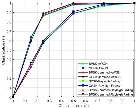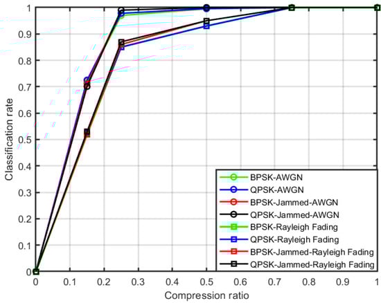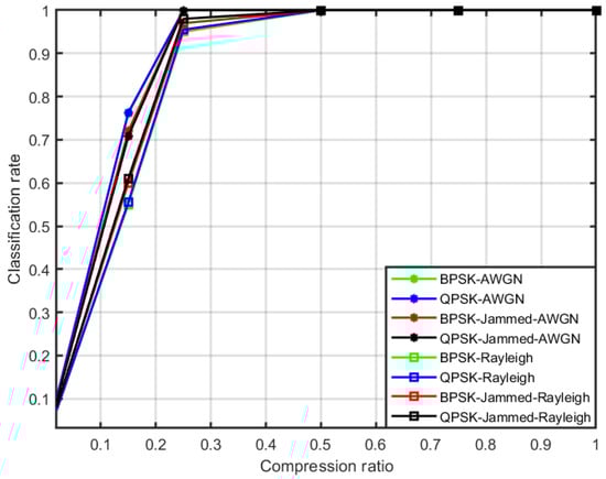 In the second phase, ANN is further tested online for the 1000 independent samples at multiple SNRs and compression ratios in the AWGN and Rayleigh fading channel. Figure 6 shows the classification rate at −5 dB for different compression ratios, where, for ANN classified the BPSK and QPSK with a rate of 0.63 and 0.64 respectively. On the other hand, the jammed sub-bands, BPSK-jammed and QPSK-jammed are classified with an accuracy of approximately 0.60. Then, by increasing the ratio, more samples are available to reconstruct the WB signal, therefore, SCF has a better estimation compared to the previous case. Hence, accuracy is improved by increasing to 0.25, it is approximately 0.86 for licit signals (BPSK to BPSK and QPSK to QPSK) and 0.88 for jammed signals (BPSK-jammed and QPSK-jammed). It is possible to infer from the figure that a classification accuracy of about 1 is obtained for . On the other hand, for the Rayleigh fading channel, the classification rate is significantly low at low compression ratios (0.15–0.4) as compared to AWGN, whereas it is comparable to accuracy achieved at high compression ratios (0.5–1).