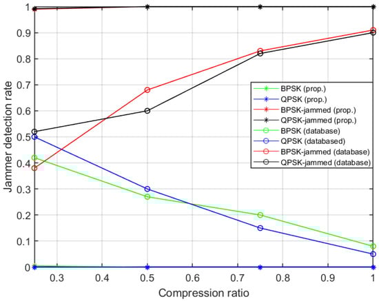 Our novel algorithm ensures high accuracy when compared to techniques reported in the literature [,,,,] that required 10–20 dB SNR to achieve comparable performances. Further, the performance of our algorithm is compared to work in [] where classification was performed using the traditional databases matching method. The authors used the same set of signals as considered in our work. They acquired signals only at 0 dB by varying compression ratio between 0.25 to 1 under the AWGN channel conditions. Figure 9 shows that embedding the ANN to the spectrum characterization algorithm not only increased the signal classification accuracy but also remarkably increased the detection rates for the jammers. The detection rate for the jammer is about 1 for at 0 dB as compared to 0.45 (average) in database parameters matching methods. Moreover, ref. [] could only able to detect the jammer with a rate of 0.9 at Nyquist rate sampling. On the other hand, in [], the algorithm used features like bandwidths, center frequencies, and maximum amplitude of the PSDs of the signals for the naive Bayes Classifier (NBC). They acquired the signals at 5 dB and 10 dB by varying the compression ratios between 0.7 and 1 under the Rayleigh fading channel. Our algorithm performance is compared for Rayleigh fading channel with this technique in Table 2 and the result shows that our newly developed algorithm outperforms this technique both in terms of jammer detection and signal classification rates. The algorithm in [] is able to classify the un-jammed modulated signals BPSK and QPSK at 5 dB with a rate of 0.76, 0.80, 8.80, and 0.82 for K/N of 0.70, 0.80, 0.90 and 1, respectively. Similarly, for BPSK-Jammed and QPSK-Jammed, the jammer detection rate is 0.40, 0.48, 0.59, and 0.70 for K/N of 0.70, 0.80, 0.90, and 1, respectively. Our approach, on the other hand, obtained signal classification and jammer detection rates of 1 for all K/N (0.7 to 1). Further, it can be noticed from Figure 6 and Figure 7 that our algorithm obtained a total classification rate of approximately 0.9 and 0.95 at −5 dB and 0 dB, respectively, in Rayleigh fading environments for the compression rate of 0.50. These high performances are acquired by using SCF of the signals, which is highly distinct for different signals, along with the ANN classifier.