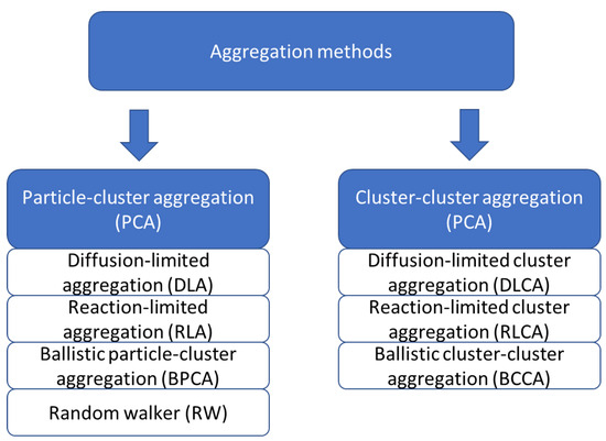 In aggregation methods, the base element of the model is a particle (globule for aerogel) of material. The main idea of aggregation methods is that particles of material are placed in space. They move and aggregate into a single cluster, forming a frame of a porous material. Aggregation methods are divided into “particle–cluster aggregation” (PCA), when moving particles aggregate with a fixed clusterization center, and “cluster–cluster aggregation” (CCA), when all particles in the system are mobile and aggregate with each other, forming local mobile clusters, which then aggregate into a single structure [27].