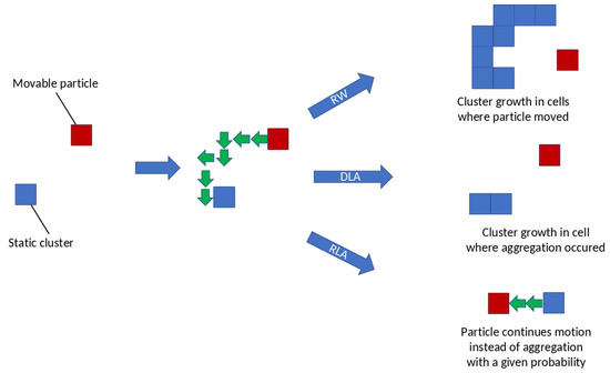 In the Figure 2 the blue and red cells represent static clusters and movable particles respectively. Depending on the aggregation principle, there are different types of PCA models: in DLA, a particle aggregates whenever there is a clusterization center near it. In the RLA model, aggregation occurs with a given probability. RW works as DLA, but after aggregation, both the particle itself and the places where it was before aggregation become clusterization centers. The BPCA model works as DLA, but the particles motion direction does not change.