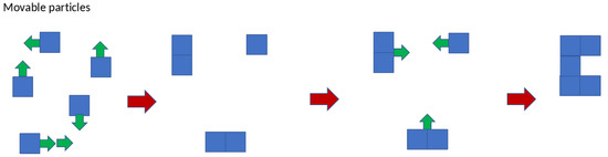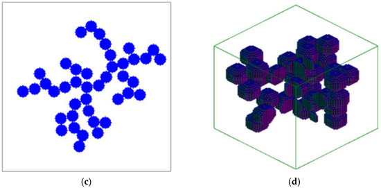 The main idea of cluster–cluster models is as follows: a given number of moving particles is placed on the field, determined by the porosity of the structure. Particles begin to move chaotically, aggregating into a single cluster after collision. Clusters consisting of several particles continue to move. The process is carried out until all the particles are aggregated into a single cluster (Figure 3).