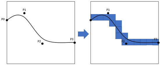 P0 and P3 indicate the beginning and the end of the curve; these points are chosen on the different field edges. P1 and P2 are points with random coordinates between P0 and P3. Bezier curve passes through P0 and P3 but does not pass through P1 and P2 (Figure 4).