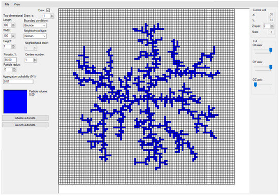 The principle of the PCA models work is as follows: one or more stationary clusterization centers are placed on the field, after which a moving particle is generated in a random place in the field; this particle makes a random movement until it is near the center. After that, aggregation occurs—the moving particle itself becomes part of the cluster and a new moving particle is generated [28]. The process is carried out until the structure reaches the specified porosity (Figure 2).