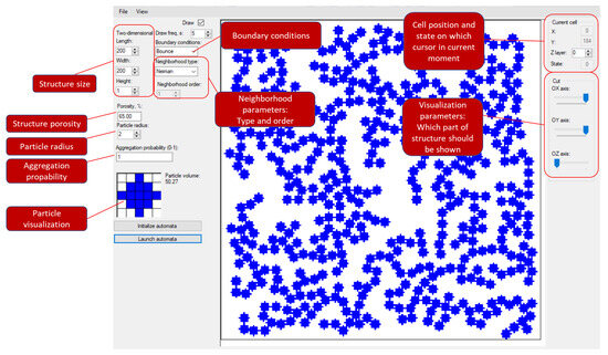 As input parameters, the module requires the geometric size of the simulation field, the particle diameter, the number of clusterization centers (in this case, aggregation with multiple clustering centers is implemented—multiDLA), the probability of aggregation upon collision (if it is less than 100%, then the RLA method is implemented) and the porosity of the structure. To generate a structure using the random walker (RW) model, a separate parameter in the generation settings must be set.