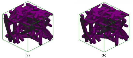 Fibrous porous structures obtained using a model based on Bezier curves for various fiber diameters and a porosity of 70%: (a) 7 nm fiber diameter; (b) 11 nm fiber diameter.