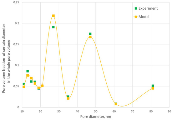 Experimental and calculated curves of the pore size distribution of the porous fibrous structure of an aerogel based on chitosan.