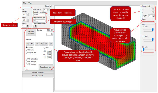In addition, the LBM can be combined with CA models, forming a single complex model for different processes, which significantly expands its application areas. The developed software uses a hybrid model that combines the lattice Boltzmann method and the cellular automata approach, which allows for predicting the processes of active pharmaceutical ingredients (API) release from the aerogel particles and its flow in various media. Flow is simulated with the LBM, and the release process is simulated with a cellular automata model.