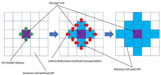 The main idea of the API release model is as follows. Each cell can have one of two states: aerogel particle and solution. Each aerogel particle cell has a given amount of API in it. Every time step, the aerogel cells near the solution cells release API in the solution cells. After that, API transportation in liquid media (solution cells) is calculated according to the LBM method (Figure 19).