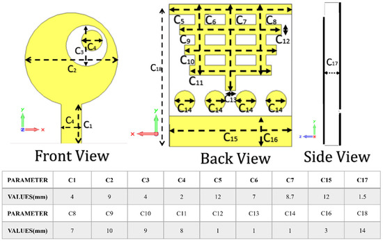 The antenna’s length, height, and width are denoted as ‘C15′ ‘ C18,’ and ‘C17′, respectively. Detailed parameter values for the design are provided in Figure 2. This section offers an in-depth examination of the specifications for the proposed radiator. It outlines the creation of a distinctive configuration incorporating a circular component called ‘C2’. This circular element is securely affixed to the primary microstrip and possesses dimensions represented by ‘C4 × C1’. To further enhance the performance of the lower-order band, a circular slot is introduced, housing a circular parasitic element within it. On the rear side of the radiator, we encounter a mesh-like structure designated as ‘C5 to C12’, which integrates four additional parasitic circular elements with a diameter specified as ‘C14’. These elements contribute to the facilitation of higher-order resonance.