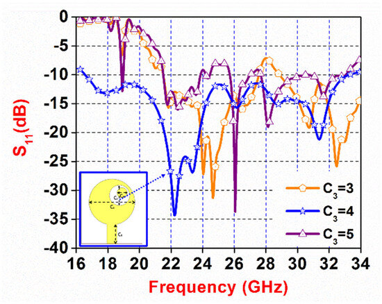 Another parameter we investigated was the diameter of the parasitic circular element on the front side, referred to as ‘C3’. We examined various sizes, ranging from 3 to 5 mm, and determined that a diameter of 4 mm worked best. This size allowed for the excitation of both lower and higher-order resonances while maintaining the magnitude of S11, a measure of antenna performance, below −10 dB across a wide range of frequencies, spanning from 16.3 to 34 GHz. The influence of this adjustment is evident in Figure 6.