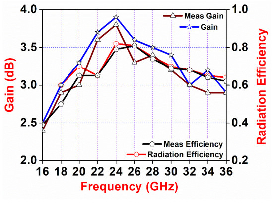 The proposed structure has undergone a comprehensive analysis to optimize its impact on the S11 parameter and other simulated outcomes. The measurement results were compared with theoretical simulations to validate the antenna’s design and verify its performance, as illustrated in Figure 9. Deviations or discrepancies between the measurements and simulations were carefully analyzed to identify potential factors influencing the antenna’s behavior. The proposed radiator demonstrates a wide impedance bandwidth, indicating its ability to operate effectively across a range of frequencies. The bandwidth is calculated as 70.4%, covering the frequency range from 16.2 GHz to 34 GHz. This broad impedance bandwidth is crucial for accommodating multiple communication bands and ensuring efficient signal transmission. A comparison between the simulated and measured return loss validates the accuracy of the simulation model, with close agreement observed. Minor discrepancies can be attributed to fabrication tolerances and measurement uncertainties. Nonetheless, the antenna demonstrates excellent impedance matching and performs admirably within the desired frequency band.