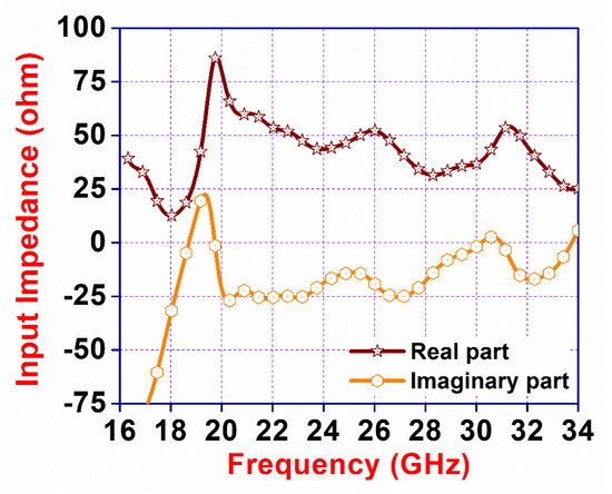 Figure 10 shows a curve representation of our proposed structure’s simulated input impedance variation. This impedance includes both the real and imaginary components, providing insights into how our design interacts with different frequencies. The curve displayed in the graph illustrates that the real component of impedance, which has been normalized to a reference value of 50 ohms, undergoes changes across the entire frequency spectrum, which spans from 16.2 to 34 GHz. Specifically, this real component ranges from 31 ohms to 69 ohms. The nature of our design’s behavior is primarily inductive within a specific frequency range, as evidenced by the positive polarity of the imaginary part of the curve between 18 and 20 GHz. Beyond this frequency range, its behavior transforms into a capacitive one, characterized by a negative polarity from 20 GHz to 30 GHz. Subsequently, the design reverts to an inductive behavior again, demonstrating characteristics that resemble both a capacitor and an inductor at higher frequencies. These impedance variations at different frequencies are crucial for understanding and optimizing the performance of our proposed structure.