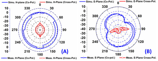 Simulated and measured Co and Cross-polarization radiation patterns. (A) H-plane pattern at 22 GHz and (B) E-plane pattern at 22 GHz.