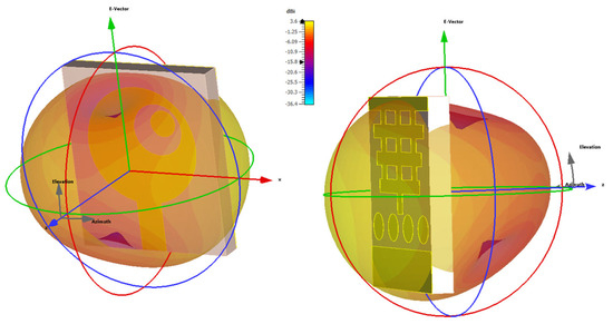 In Figure 4A, we can observe the reflection coefficient of the proposed radiator, which signifies the magnitude of S11. These figures systematically depict the evolution of the antenna design. Beginning with Step 01, the initial configuration comprises a straightforward circular patch positioned above a stable ground plane. This circular element, measuring 9 mm in diameter, is connected through a microstrip line with dimensions of 2 mm × 4 mm. The backplane, with dimensions of 12 × 3 mm2, gives rise to single-band resonances spanning from 23.8 to 36 GHz, as presented in Figure 4A. A comparison of all steps in both the E-plane and H-plane is presented in Figure 4B.