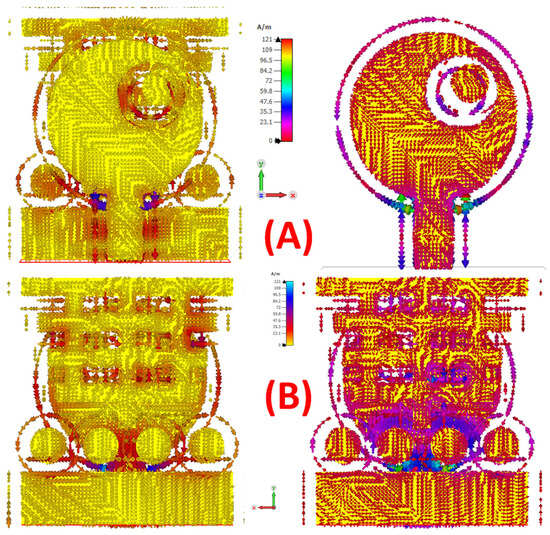 Surface current distribution of the antenna at (A) 22 GHz and (B) 32 GHz.