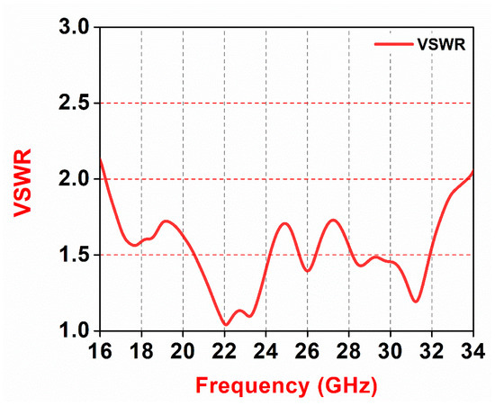 The results presented in Figure 14 validate the antenna’s design and shed light on its impedance-matching capabilities. This analysis contributes to a comprehensive understanding of the antenna’s behavior, ensuring its suitability for practical communication applications. The VSWR assessment is a fundamental step in confirming the antenna’s effectiveness, aligning with industry standards and critical to evaluating overall antenna performance.