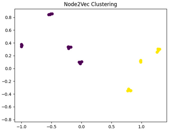 Initially, the embeddings, which encapsulate underlying node interdependencies, are extracted and transformed into two-dimensional representations through Principal Component Analysis (PCA). This dimensionality reduction technique condenses the high-dimensional embeddings into a format that can be effectively visualized and analyzed. Subsequently, the reduced embeddings undergo a K-means clustering procedure, an unsupervised learning technique, that categorizes similar nodes into distinct groups or clusters. This clustering approach effectively identifies nodes that share common relationships, enabling the identification of meaningful patterns within the graph. The GL technique is implemented using Node2Vec [40].
