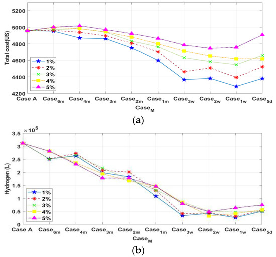 Finally, we examined the integrated effects of interval length M and replacement cost ratio . The results indicated that M = 1 week is the optimal interval for reducing system costs and hydrogen consumption regardless of . Conversely, increasing the replacement cost ratio tended to demolish the merits of the extended-window method because the system tended to make fewer component changes.