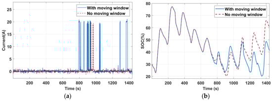 The real-time simulation applied the optimal system settings of two periods when M = 5 days and : Period I is 16–20 April 2015 and Period II is 21–25 April 2015. In Period I, the optimal settings are (b, s) = (8, 5) and (SOClow, SOChigh) = (40%, 50%). With no extended-window model prediction, the optimal settings remained the same in Period II. With extended-window model prediction, the optimal settings became (b, s) = (10, 7) and (SOClow, SOChigh) = (40%, 50%) in period II. The practical implementation consists of a PEMFC and a loadmeter. When the system needed supplementary power, the simulation model sent current commands to the PEMFC, which was then physically activated to provide the required current. The original period was ten days; we applied a scale factor of 1/600 to shorten the experimental time to 24 min, with the initial SOC = 30%. We measured system signals, such as the currents and voltages, to detect signs of potentially declining efficiency.
