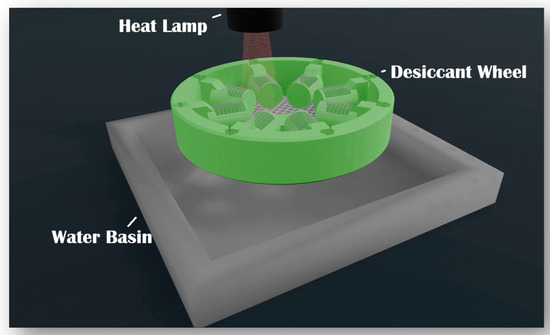 A heat lamp was positioned above the rotating desiccant wheel rings; the air was blown from the top, and a water basin was beneath them. The desiccant wheel rings were under constant heat from the lamp. Water vapor was forced out of the pockets into the basin, where a heatsink improved the condensation and connection. The components of the system are labeled in Figure 2.
