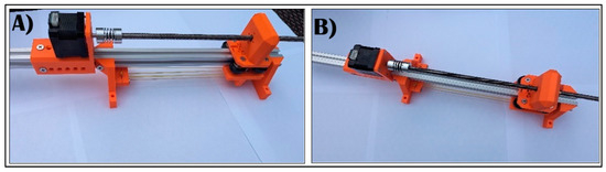 The NiTi water harvester had a straightforward gantry design, used in tandem with a high-torque Nema 17 stepper motor (OSM Technology, Ningbo, China) [28,29]. The elongated design and NiTi wires enabled it to collect water and regulate its temperature by moving the harvester to a different location. A T8 lead screw was used to apply more pressure to the NiTi wires, adding a slight mechanical advantage to the design. The NiTi harvester used 3D-printed components made by applying the same settings as those of the desiccant wheel harvester. The model was secured according to the prototype’s rendering. Finally, T-nuts were fastened to the supplied gantry. The prototype was wired with a generic 8-A DC barrel jack power supply and controlled with an ATmega328P microcontroller (Microchip Technologies, Chandler, AZ, USA). Figure 4 shows the side and top views of the NiTi harvester.