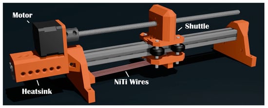 NiTi system with labeled components, including NiTi wires, shuttle, motor, and heatsink.